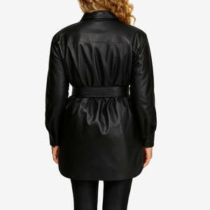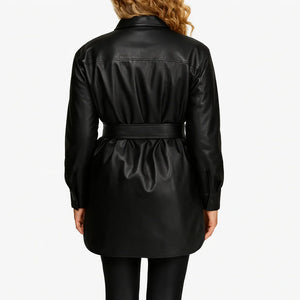 Meet your new year-round staple: a women’s shirt-jacket (“shacket”) crafted from genuine lambskin leather in a sleek, jet-black finish. The buttery-soft hide drapes beautifully while the optional self belt lets you cinch the waist for definition or wear it open for a relaxed, off-duty look. Thoughtful tailoring—point collar, matte snap buttons, flap chest pockets, button cuffs, a back yoke, and a curved shirttail hem with side slits—delivers a clean, modern line that layers over tees, knits, and dresses.